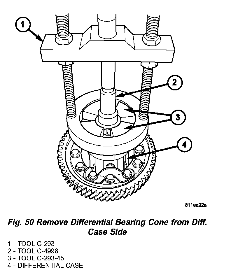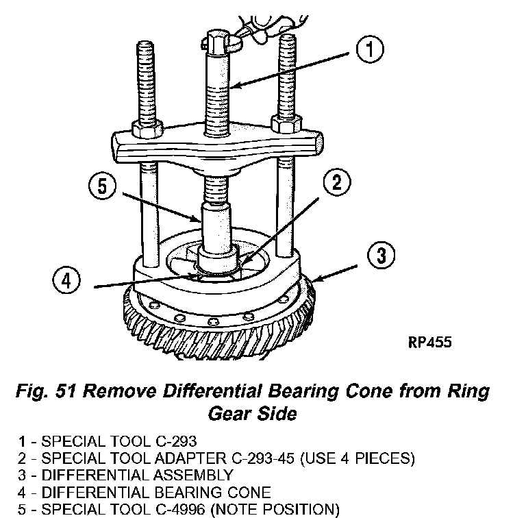 1. Remove differential bearing cones (ring gear and diff. case side) using Tool C-293-PA, Adapters C-293-45, and Tool 4996 (Fig. 50) (Fig. 51).