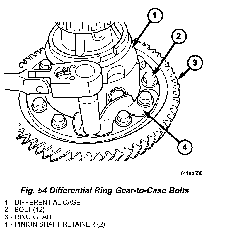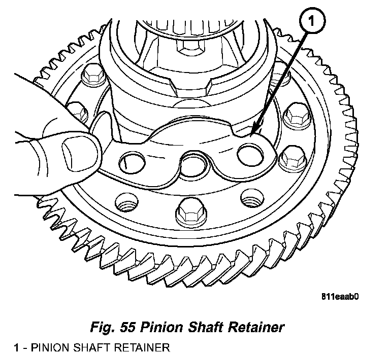 3. If servicing only pinion and side gears, remove ring gear-to-case bolts at pinion shaft retainer only (Fig. 54). Remove pinion shaft retainer (Fig. 55). Discard and use NEW bolts upon assembly.