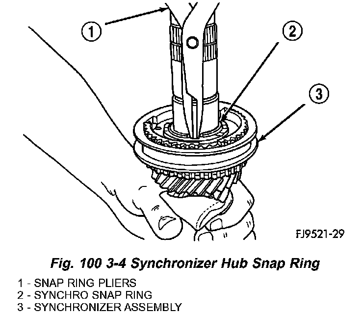 9. Remove blocking ring. Remove 3-4 synchronizer hub retaining snap ring (Fig. 100).