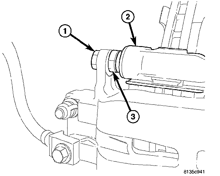 6. Install Upper caliper guide pin bolt (1). While holding guide pin (3) stationary tighten bolt to 31 Nm (23 ft. lbs.) torque.
