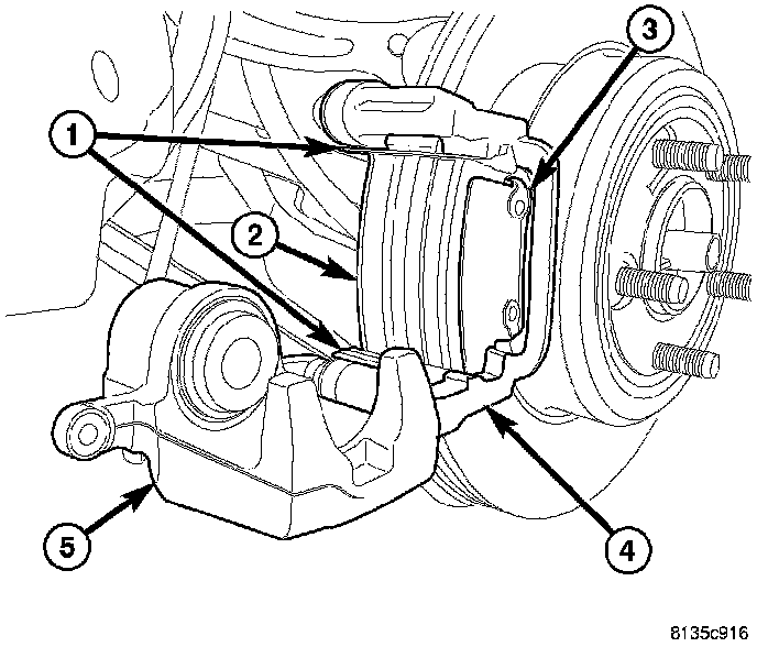 5. Remove inboard (2) and outboard (3) brake pads from caliper adapter (4).