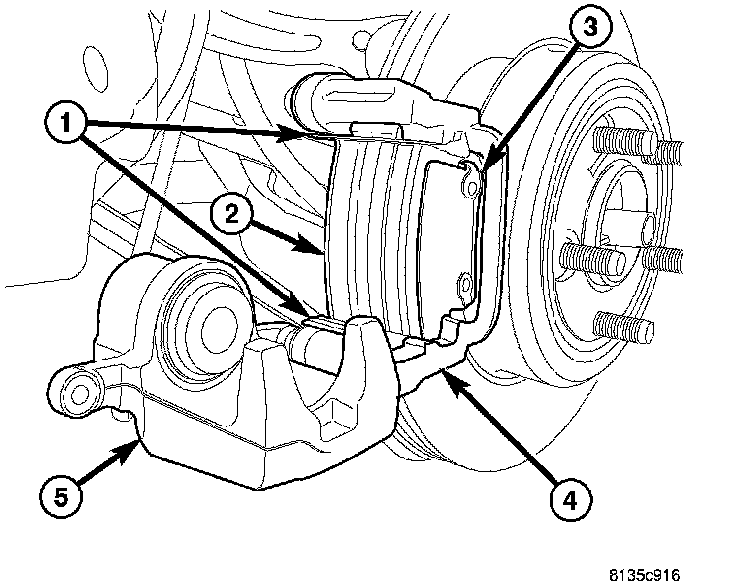 4. Rotate caliper downward (5), exposing brake pads (2 and 3). Use care not to overextend brake hose when doing this or damage may occur.