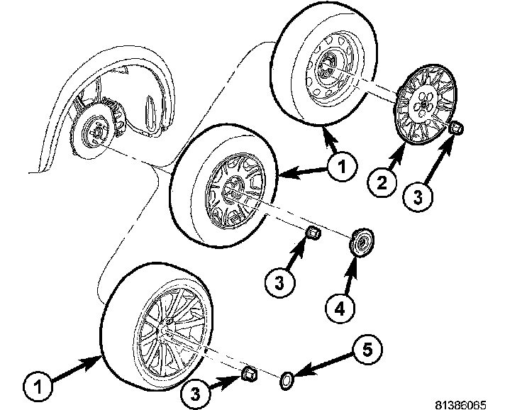 2. Remove wheel mounting nuts (3), then tire and wheel assembly (1).