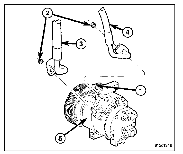 6. Remove the tape or plugs from the fitting on the front section of the A/C suction line (3) and the inlet port of the A/C compressor (5).