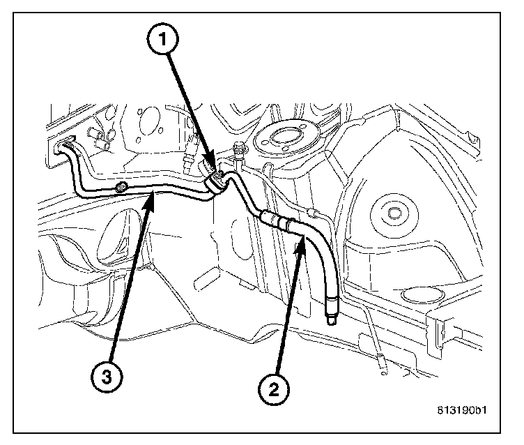 2. Remove the tape or plugs from the fittings that connect the front section of the A/C suction line to the rear section of the A/C suction line (3).