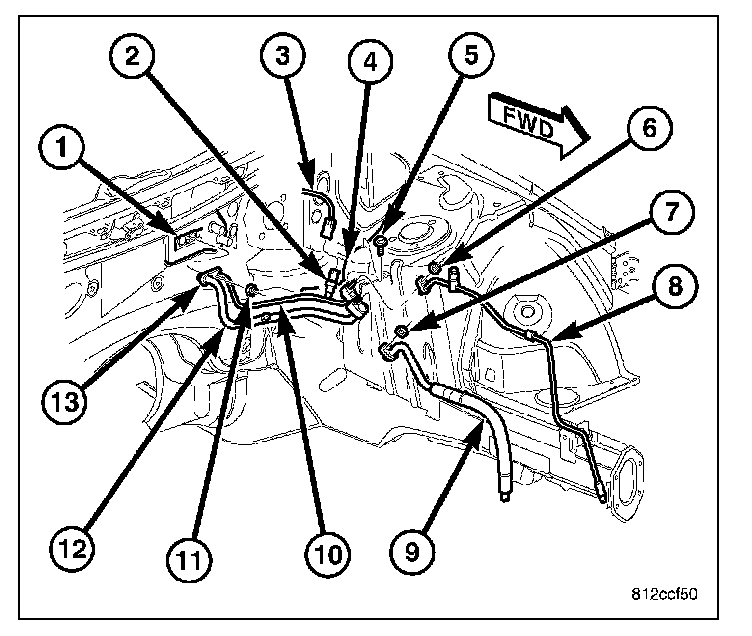 4. Remove the nut (7) that secures the front section of the A/C suction line (9) to the rear section of the suction line (12).