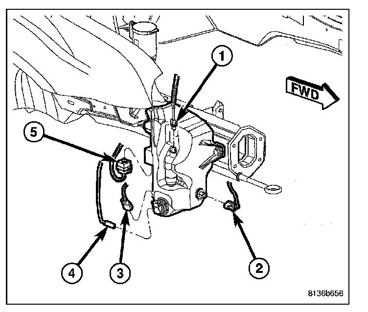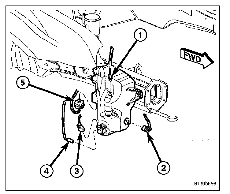 2. Drain washer fluid from the reservoir and into a suitable clean container. This can be done by disconnecting the windshield washer hose from the front (outboard) washer pump and allowing the washer fluid to drain into a container through a temporary jumper hose connected to the front washer pump.