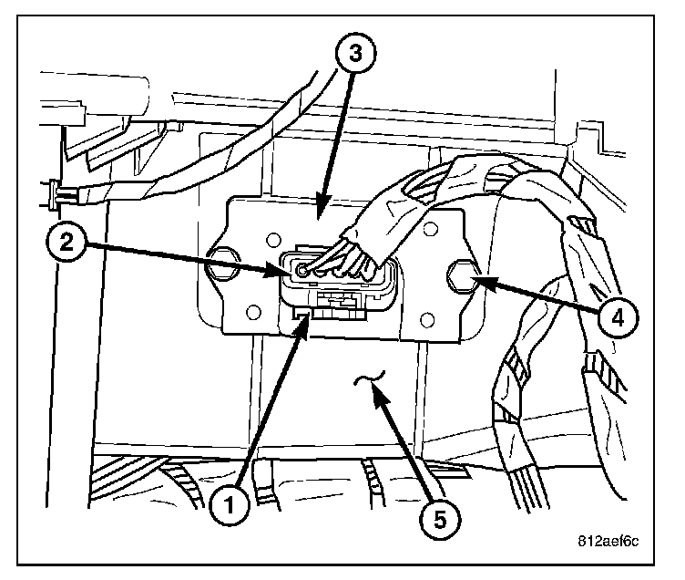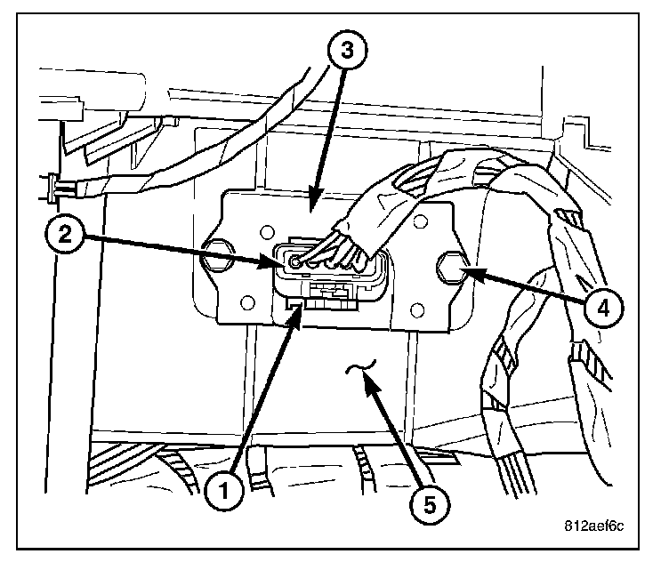 4. Remove the two screws (4) that secure the blower motor resistor to the HVAC housing (5) and remove the resistor.