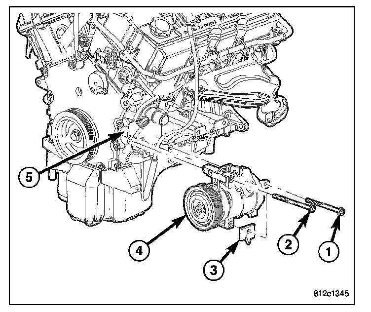 11. Support the A/C compressor (4) and remove the bolts (1 and 2) that secure the automatic transmission cooler line bracket (3) and the compressor (4) to the cylinder block (5).