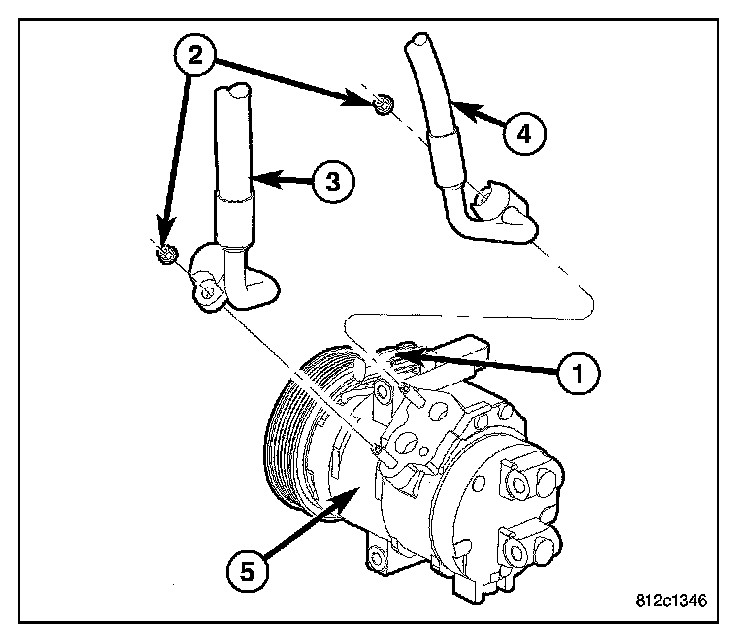 8. Install the suction and discharge lines onto the A/C compressor (5).