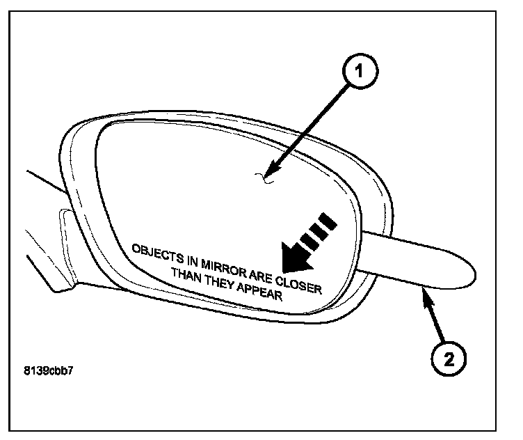 3. Using a trim stick C-4755 or equivalent flat bladed tool (2), release the two outer mirror glass holder retaining clips from the mirror motor by inserting the trim stick between the mirror glass holder and the mirror motor.