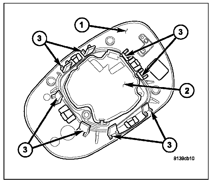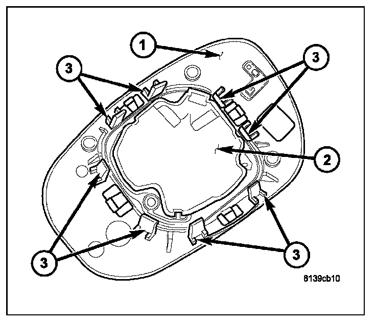 2. Position the mirror glass holder (1) to the mirror assembly and align the eight mirror glass retaining clips (3) to the mirror motor (2).