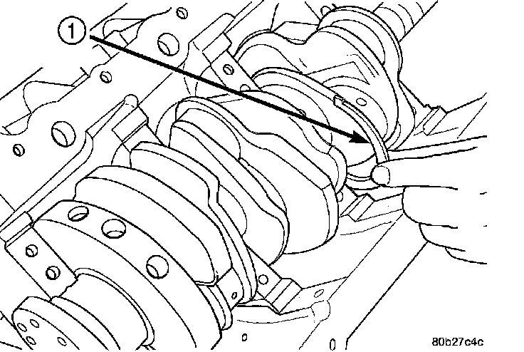 3. Move crankshaft forward to limit of travel. Lubricate and install the front thrust washer (1) by rolling the washer (1) onto the machined shelf between the No. 2 upper main bulk head and crankshaft thrust surface.