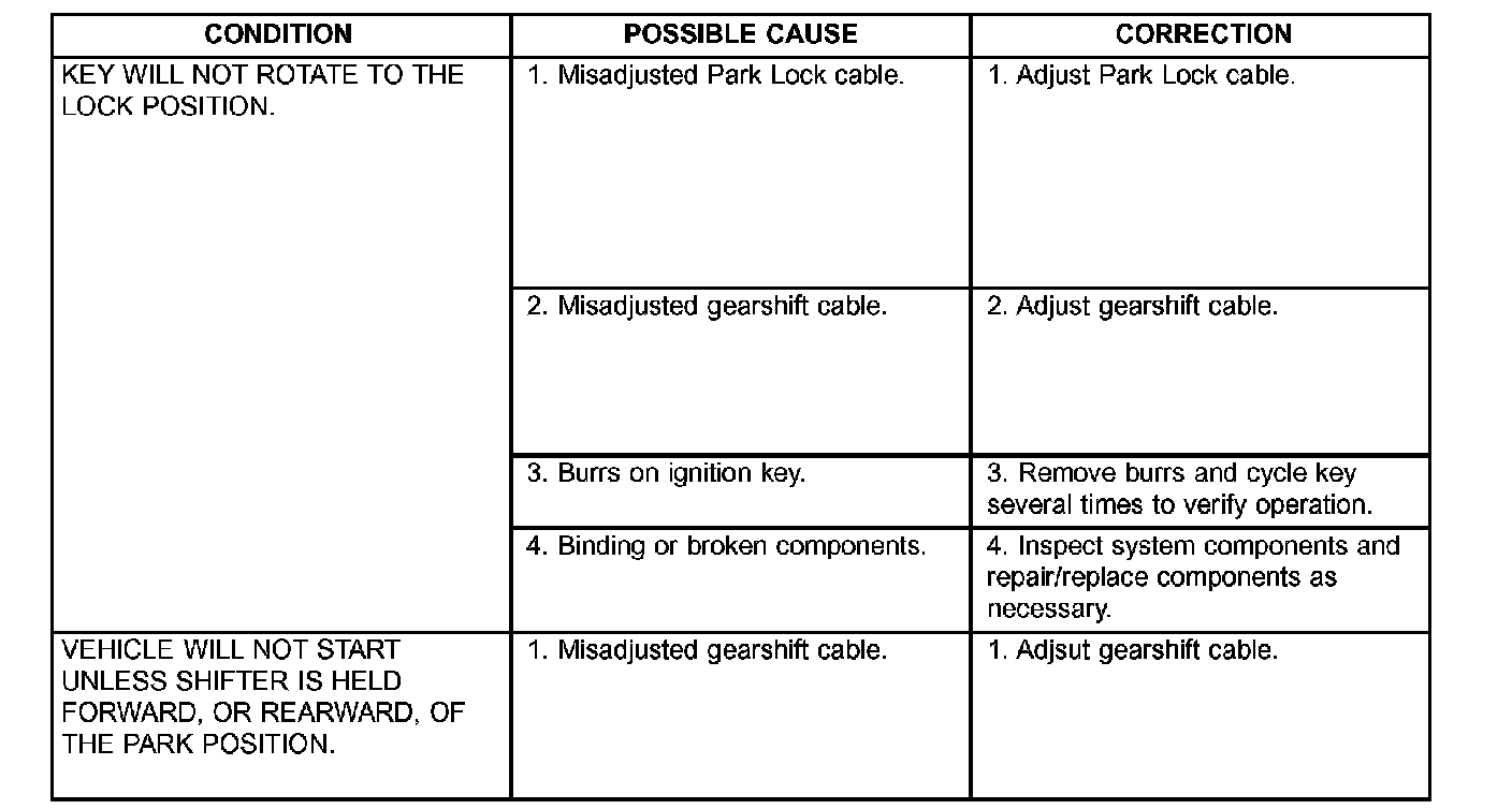 2. When the shift lever is in PARK, the ignition key cylinder should rotate freely from ACC to LOCK. When the shifter is in any other gear or neutral position, the ignition key cylinder should not rotate to the LOCK position.