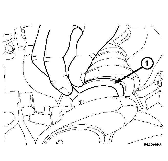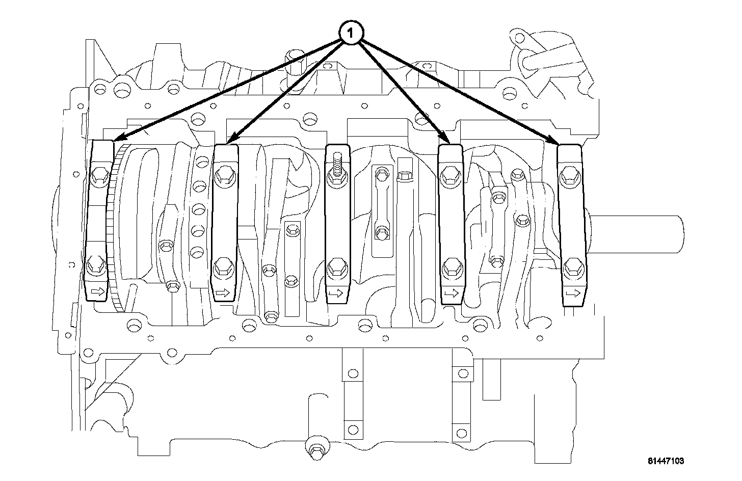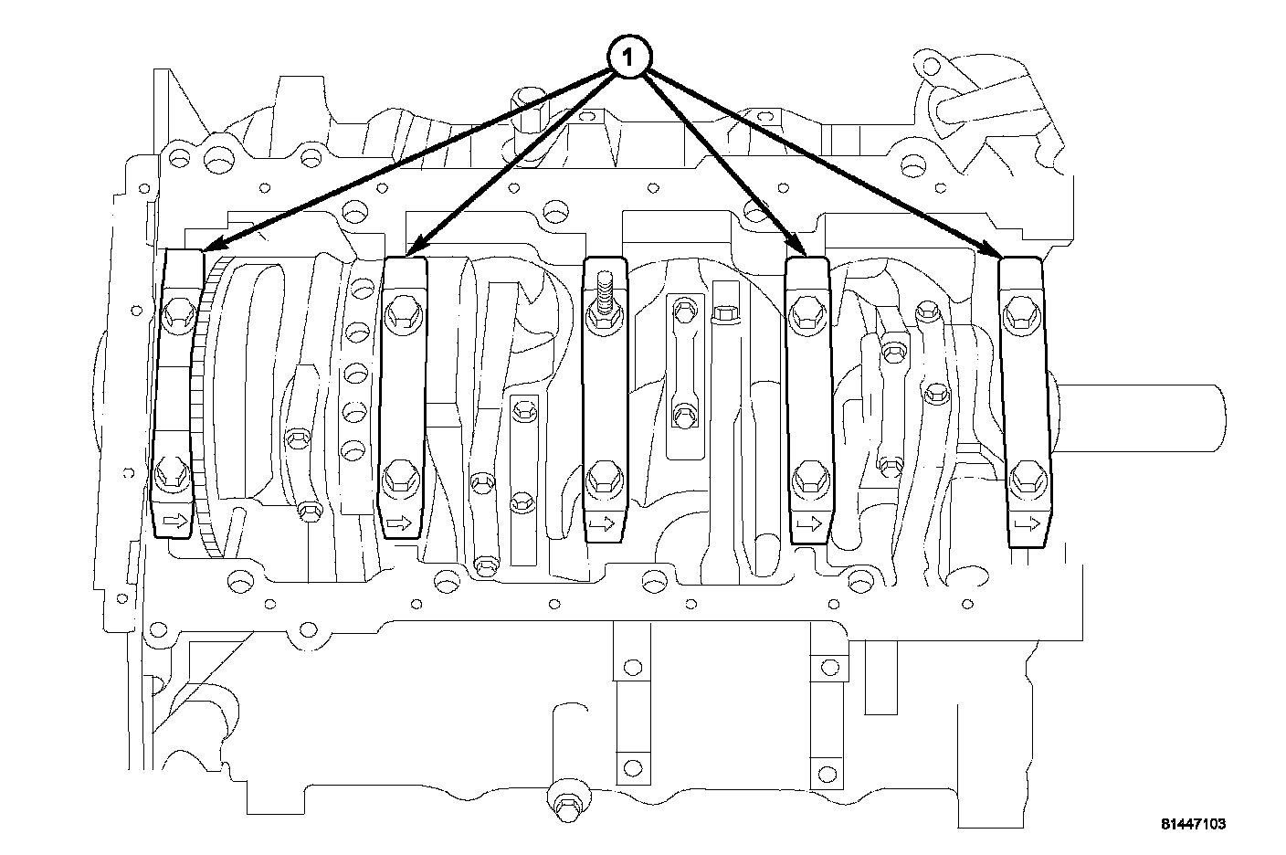 5. Clean and oil all cap bolts. Install all main bearing caps (1). Install all cap bolts and alternately tighten in two steps using the following sequence.