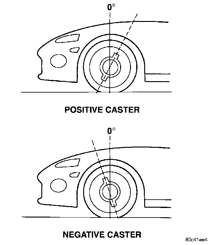 Caster is the forward or rearward tilt of the steering knuckle in reference to the position of the upper and lower ball joints. Caster is measured in degrees of angle relative to a true vertical center line. This line is viewed from the side of the tire and wheel assembly.