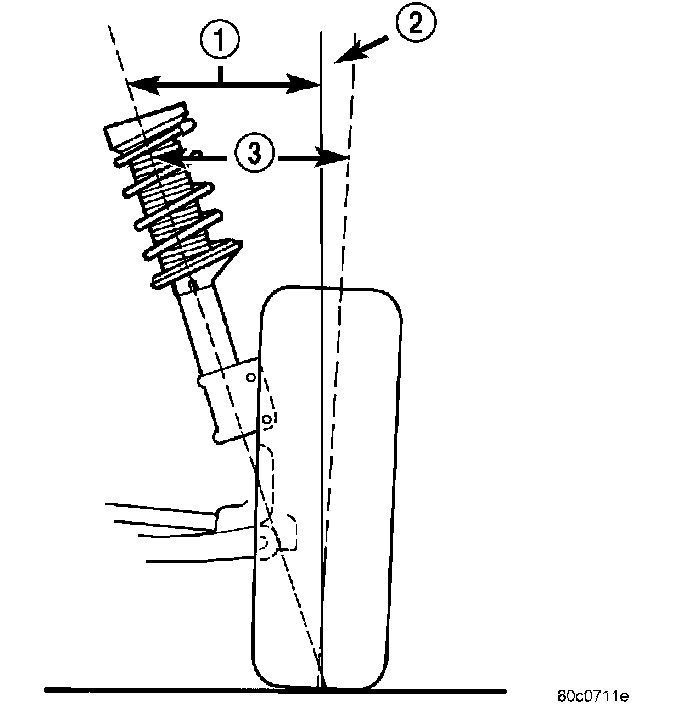 Included angle (3) is the sum of the S.A.I. angle (1) plus or minus the camber angle (2), depending on whether or not the wheel has positive or negative camber. If camber is positive (2), add the camber angle to the S.A.I. angle. If camber is negative, subtract the camber angle from the S.A.I. angle. Included angle is not adjustable, but can be used to diagnose a frame misalignment or bent suspension component (spindle, strut).