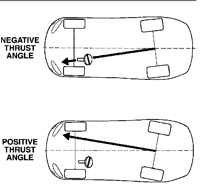 Thrust angle is the averaged direction the rear wheels are pointing in relation to the vehicles center line. The presence of negative or positive thrust angle causes the rear tires to track improperly to the left or right of the front tires (dog tracking).