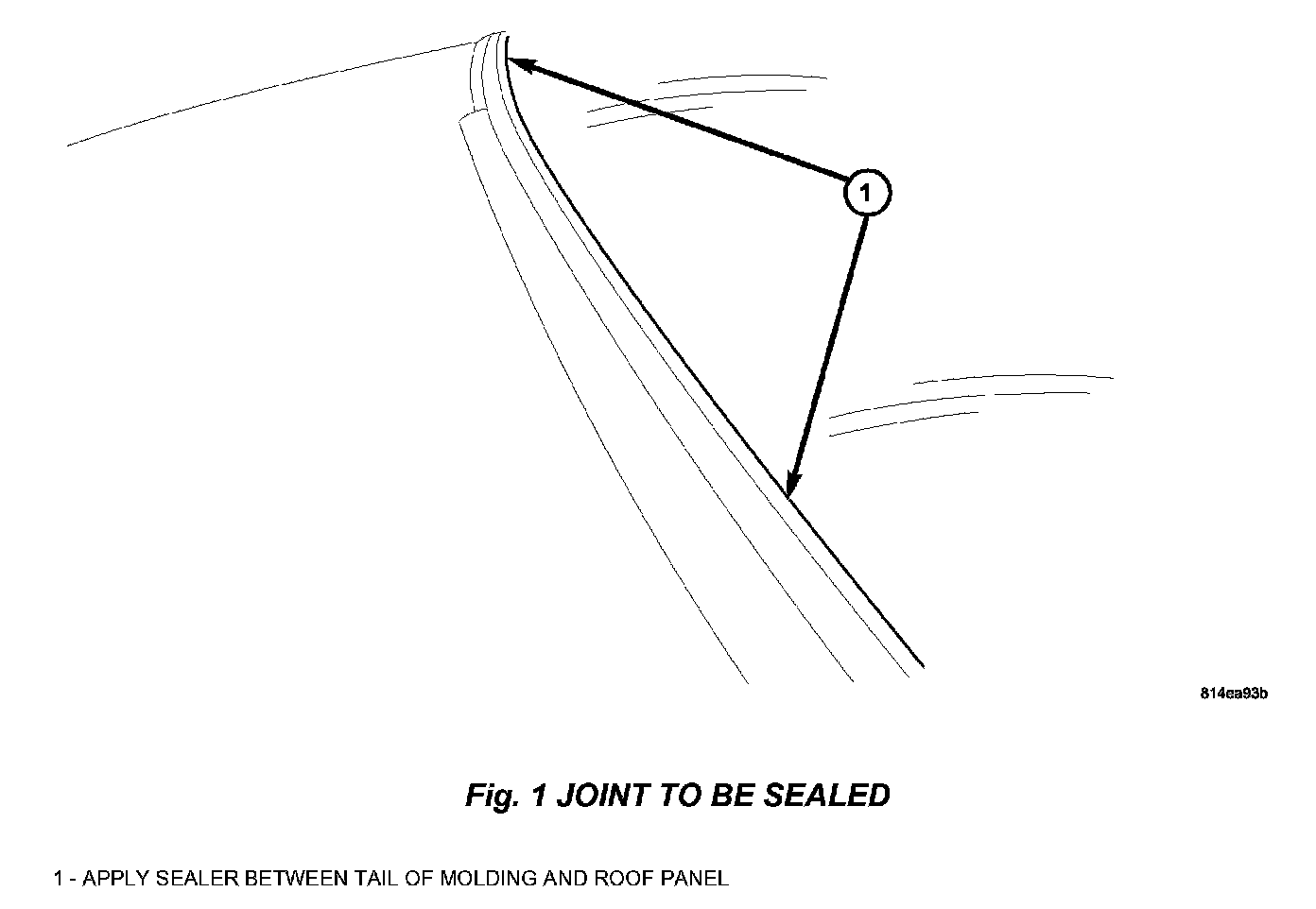 1. Use a trim stick to hold the tail section of the windshield molding away from the roof panel and use an alcohol wipe to clean all the way across the vehicle between the molding and roof panel. (Fig. 1).
