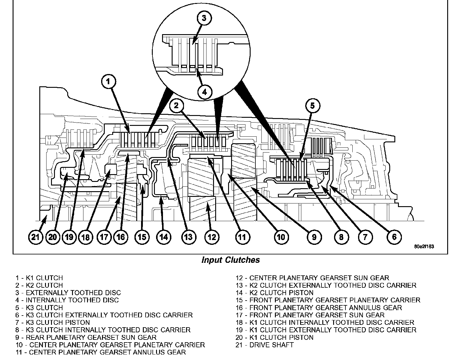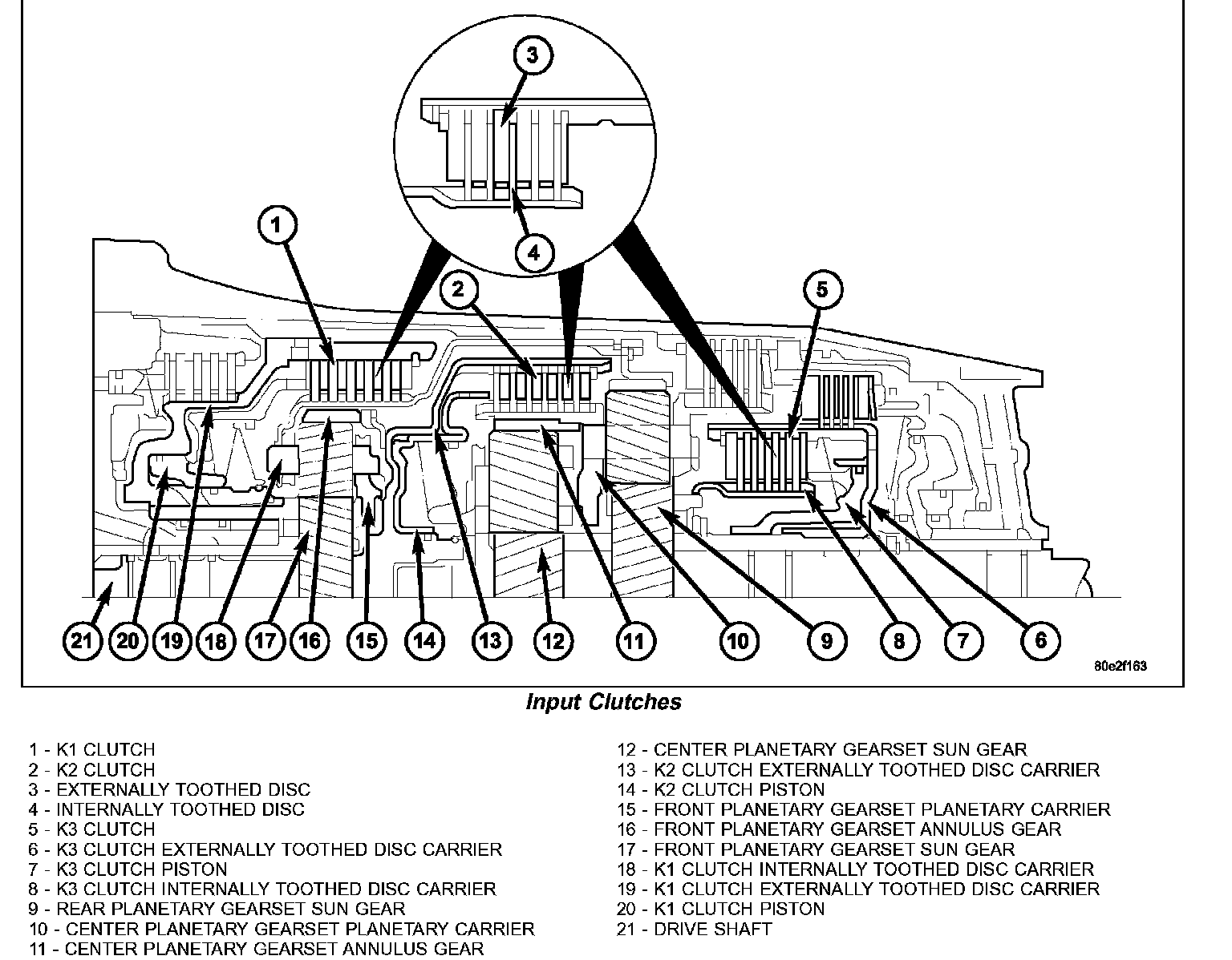 Three multi-plate input clutches (1, 2, 5), the front, middle and rear multi-plate clutches K1 (1), K2 (2), and K3 (5), are located in the planetary gear sets in the transmission housing.