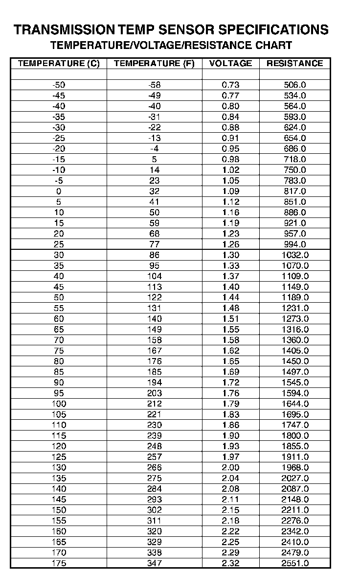 Refer to the Transmission Temperature Sensor Specifications table for the relationship between transmission temperature, sensor voltage, and sensor resistance.