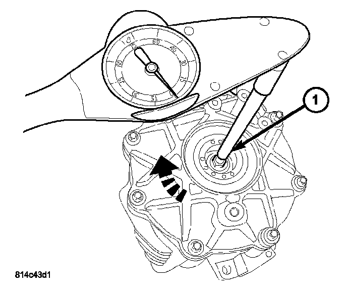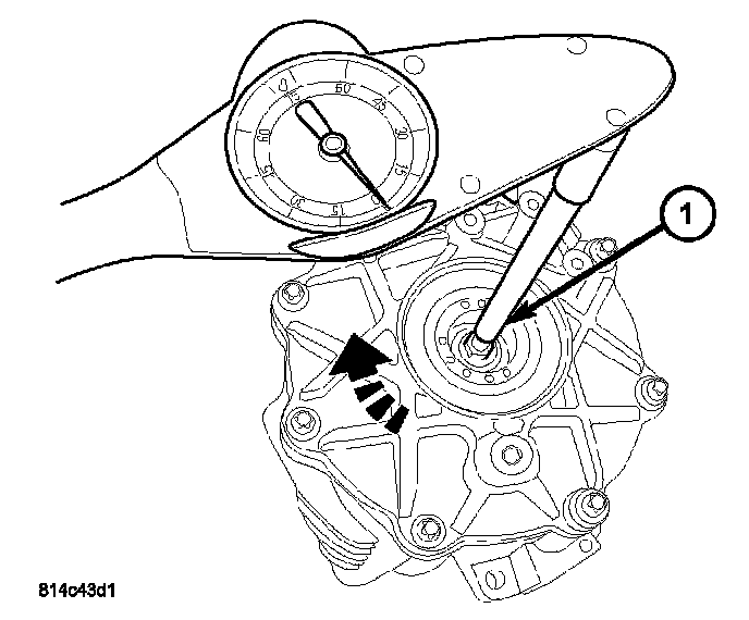 2. Using a dial-type torque wrench (1), measure pinion housing rotating torque. Rotating torque should be within 130 - 260 Nm (12 - 23 inch lbs.). If rotating torque is below this range, disassemble pinion housing, measure and install a slightly thicker spacer (1), reassemble and reverify. If rotating torque is above this range, disassemble pinion housing, install a slightly thinner spacer, reassemble and reverify rotating torque.