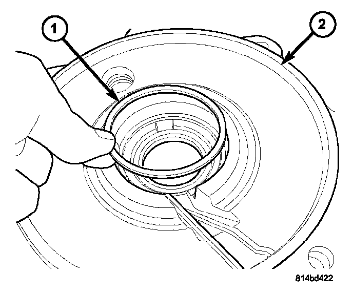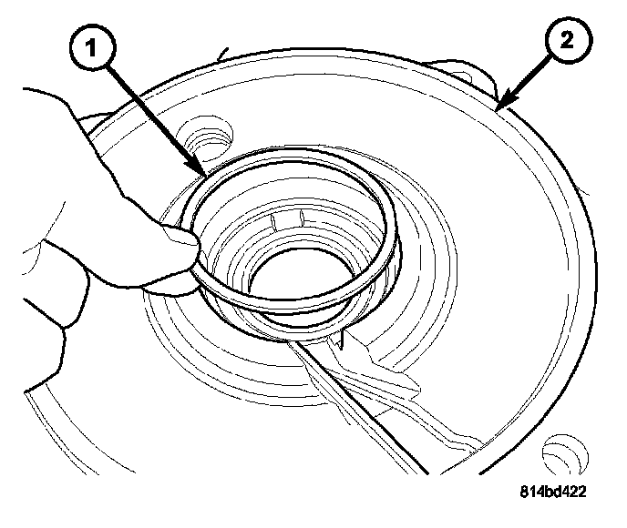 9. Install new differential side bearing preload shim (1) into axle housing cover (2).