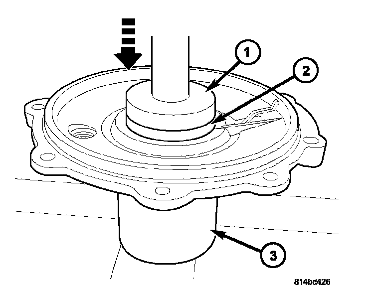 10. Using Tools C-4171 and D-129 (1), press new side bearing cup into cover until it bottoms. Use suitable cup (3) to support and protect cover.