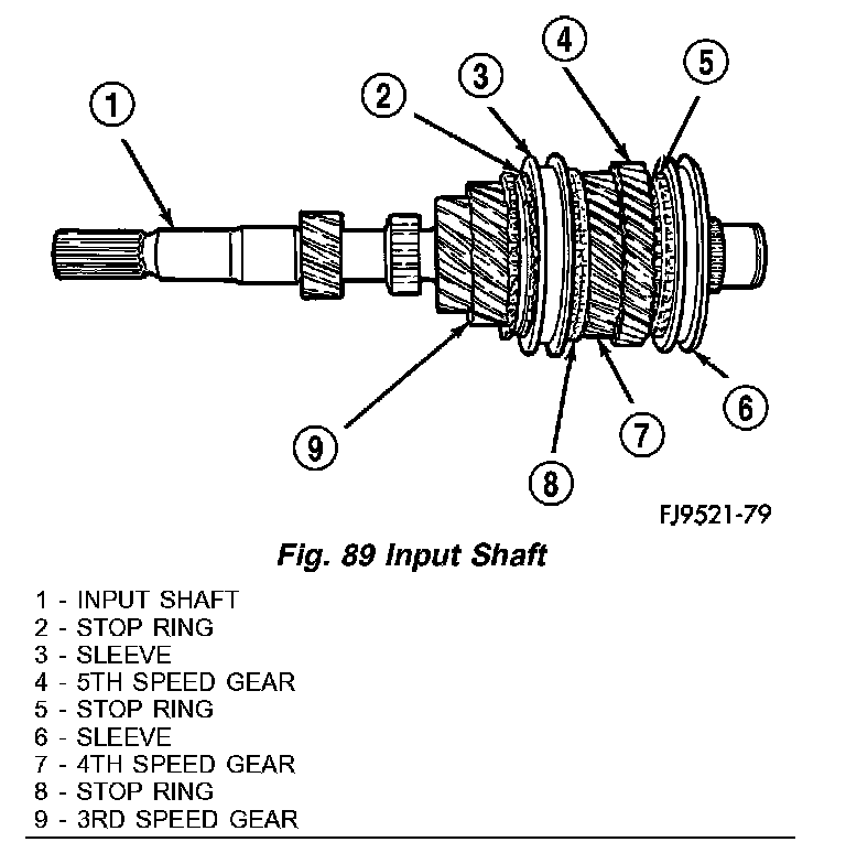 Before disassembly of the input shaft (1) (Fig. 89), it is necessary to check the synchronizer stop ring gap. Use a feeler gauge to measure the gaps between the stop rings (2,5 and 8) and the speed gears. The correct gaps are: