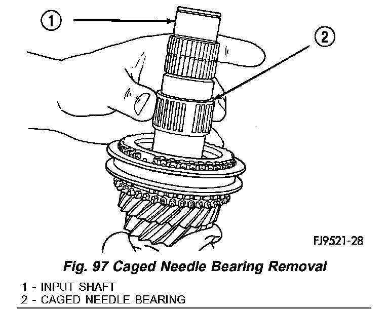 (8) Remove 4th gear caged needle bearing (2) (Fig. 97). Check the caged needle bearing (2) for a broken retention spring.