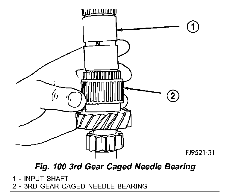 (11) Remove 3rd gear caged needle bearing (2) (Fig. 100). Inspect needle bearing for a broken retention spring.