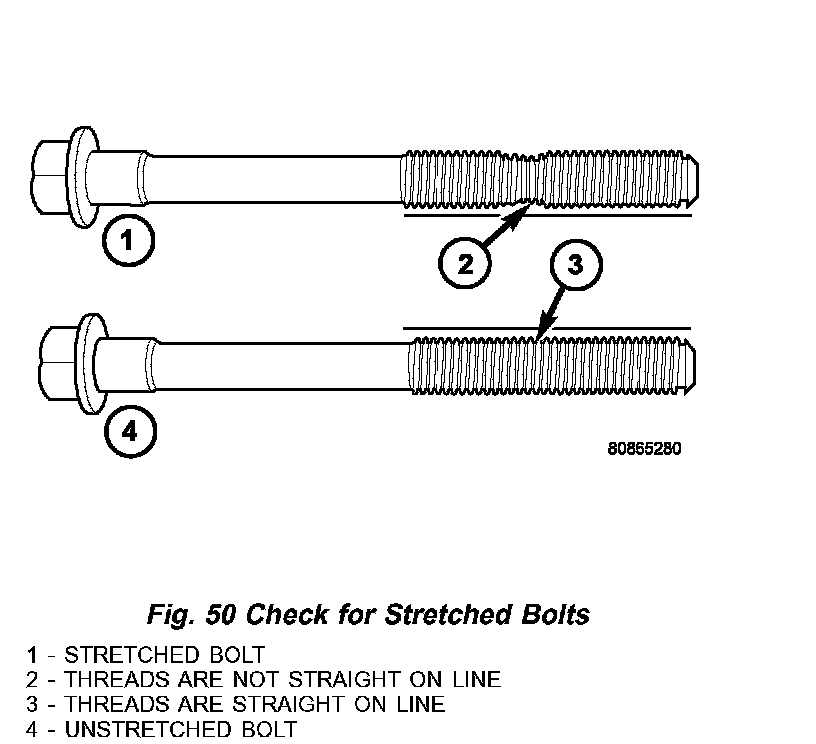 NOTE: The connecting rod bearing cap bolts must be examined before reuse. If the threads are necked down due to stretching, the bolt(s) must be replaced (Fig. 50).