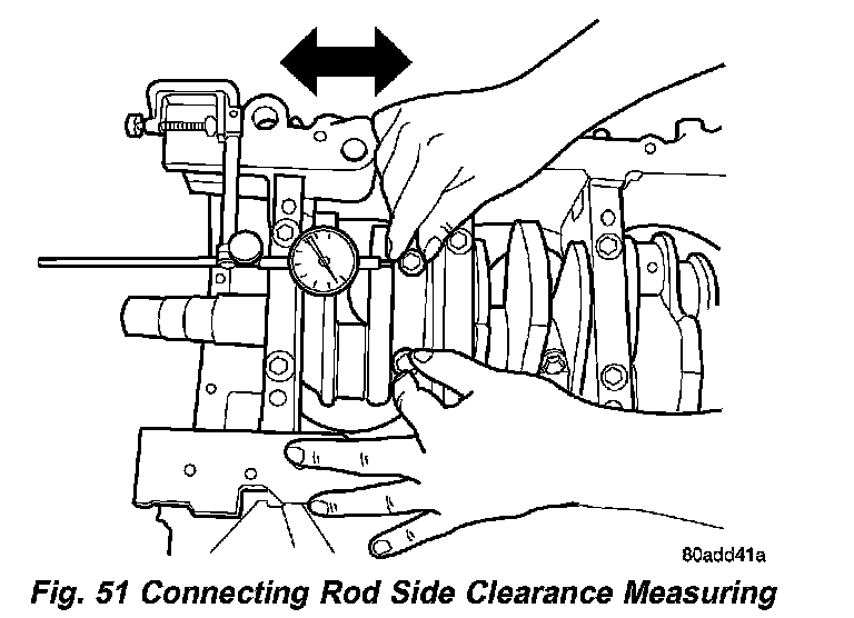 1. Mount a dial indicator to a stationary point on engine. Locate probe perpendicular to and resting against the connecting rod cap being checked. Move connecting rod all the way to rear of its travel. Zero the dial indicator. Move connecting rod forward to limit of travel and read the dial indicator (Fig. 51). Compare measurement to specification listed in engine specifications. Repeat procedure for each connecting rod. Turn crankshaft for connecting rod accessibility.