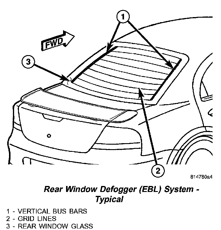 The rear window defogger system, also known as electric backlight (EBL), consists of two vertical bus bars linked by a series of grid lines fired onto the inside surface of the rear window.