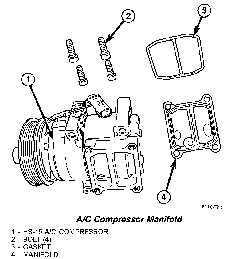 COMPRESSOR MANIFOLD AND GASKETCAUTION: To prevent the entrance of dirt and moisture into the A/C compressor, have all replacement components readily available to minimize the time the system must be opened.