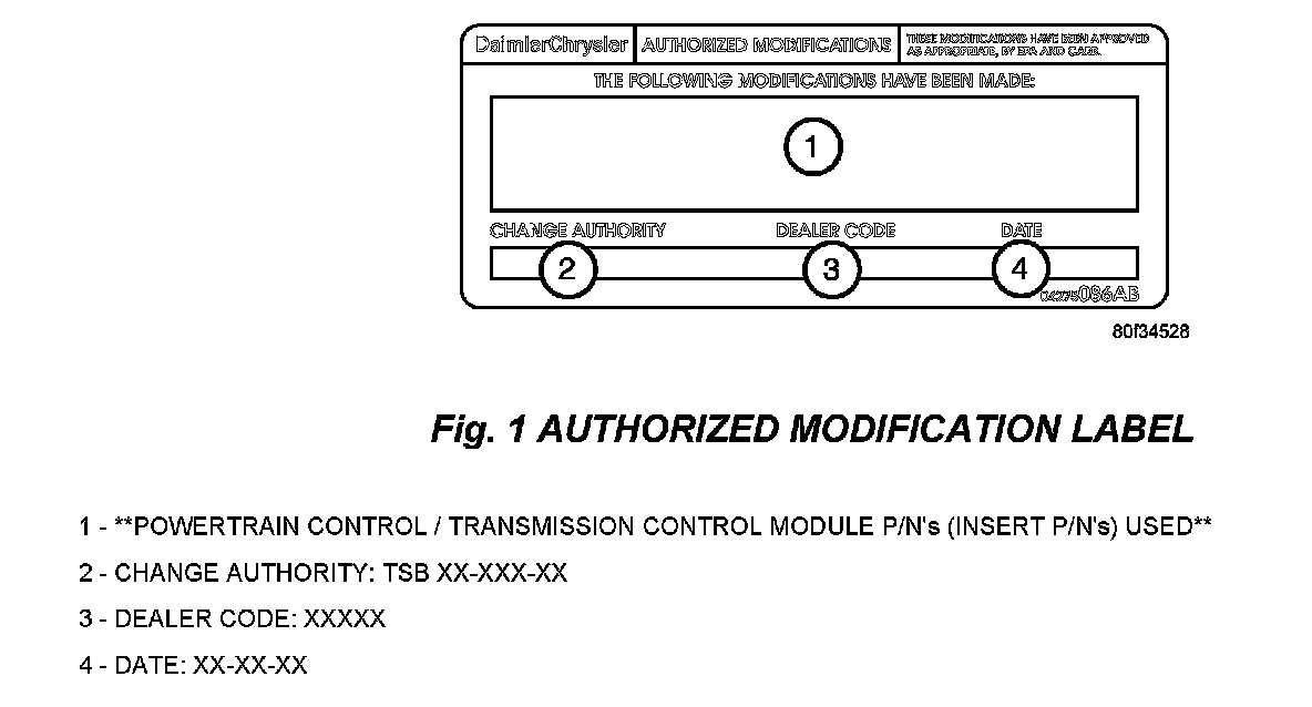 6. Type the necessary information on the "Authorized Modification Label p/n 04275086AB and attach near the VECI label (Fig 1).