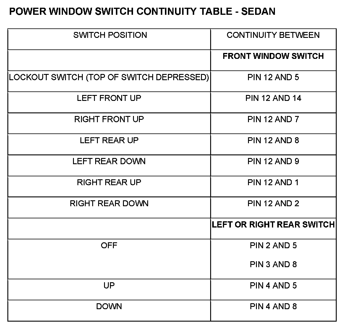 Remove the switch. Using an ohmmeter, test the window switch for continuity in all positions listed in the Continuity Table. Refer to the Power Window Switch Continuity table to determine if continuity is correct.