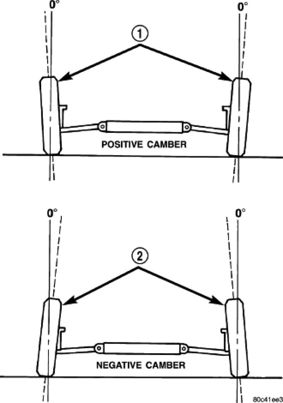 Camber is the inward or outward tilt of the top of the tire and wheel assembly. Inward tilt (2) is known as negative camber. Outward tilt (1) is known as positive camber. Camber is measured in degrees of angle relative to a true vertical line. Camber is a tire wearing angle.
