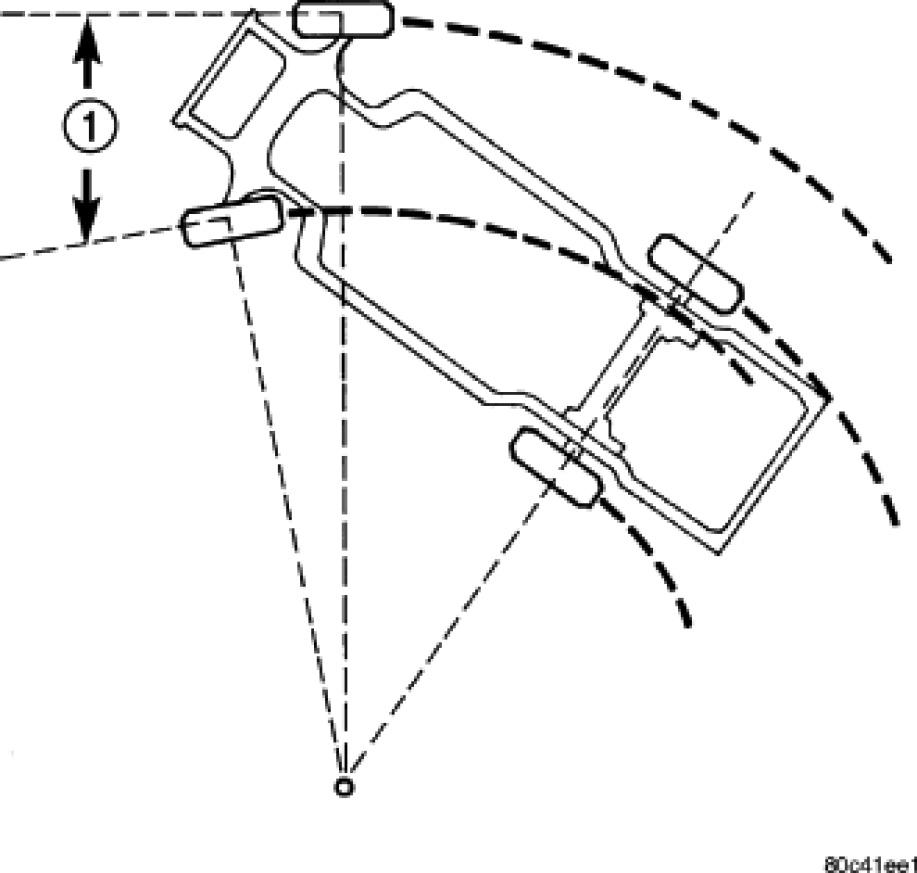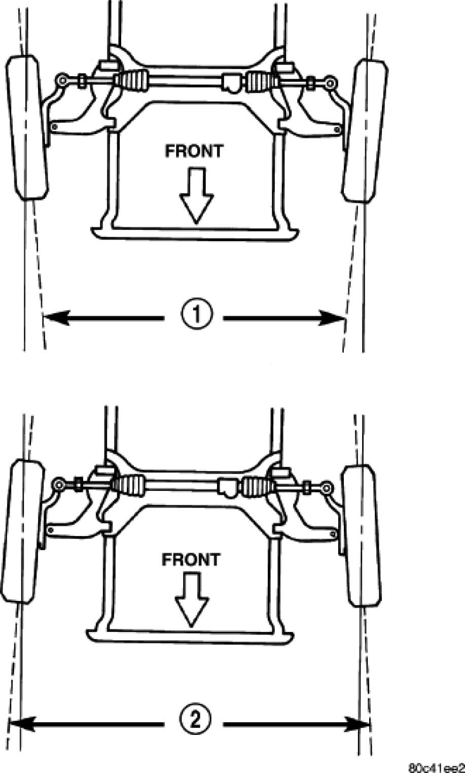 Toe-out on turns (1), sometimes referred to as Ackerman Steering, is the relative positioning of the front wheels while steering through a turn. This compensates for each front wheel's turning radius. As the vehicle encounters a turn, the outboard wheel must travel in a larger radius circle than the inboard wheel. The steering system is designed to make each wheel follow its particular radius circle. To accomplish this, the front wheels must progressively toe outward as the steering is turned from center. This eliminates tire scrubbing and undue tire wear when steering a vehicle through a turn.