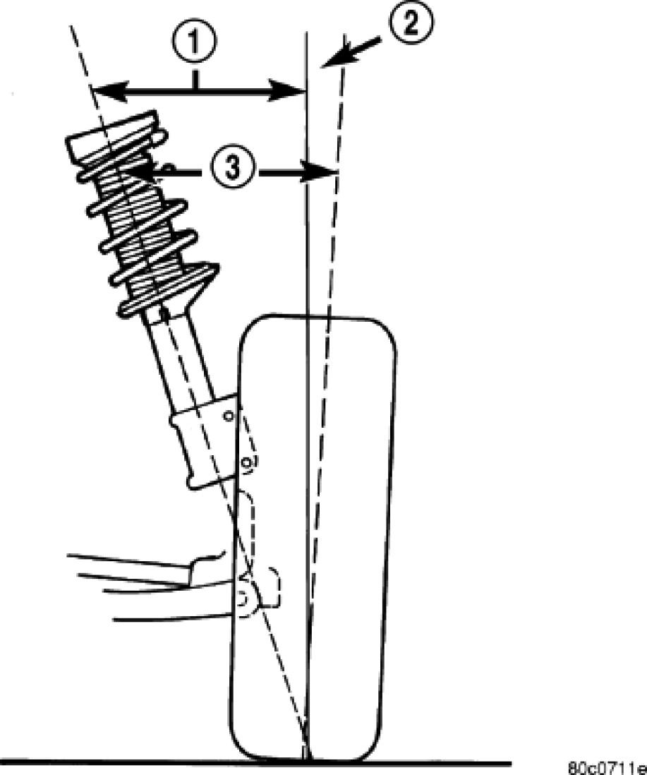 Included angle (3) is the sum of the S.A.I. angle (1) plus or minus the camber angle (2), depending on whether or not the wheel has positive or negative camber. If camber is positive, add the camber angle to the S.A.I angle. If camber is negative, subtract the camber angle from the S.A.I. angle. Included angle is not adjustable, but can be used to diagnose a frame misalignment or bent suspension component (spindle, strut).