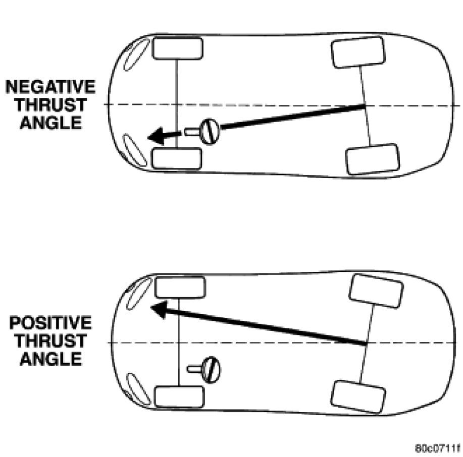 Thrust angle is the averaged direction the rear wheels are pointing in relation to the vehicle's center line. The presence of negative or positive thrust angle causes the rear tires to track improperly to the left or right of the front tires (dog tracking).