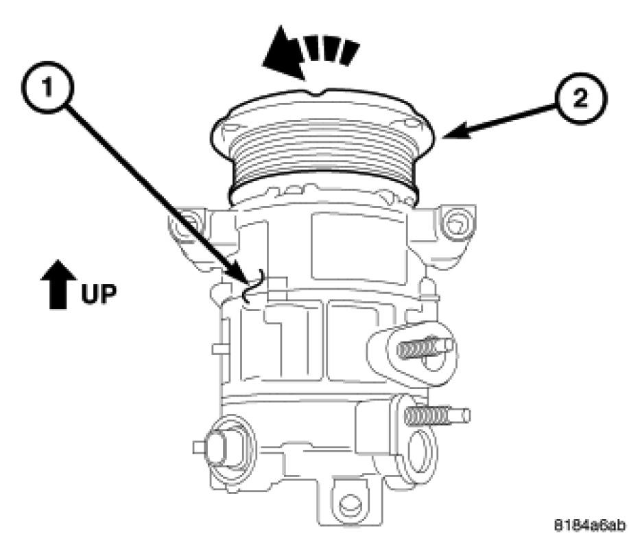 3. Reposition the A/C compressor (1) so that the pulley (2) is facing upward and slowly rotate the compressor pulley clockwise one full turn.