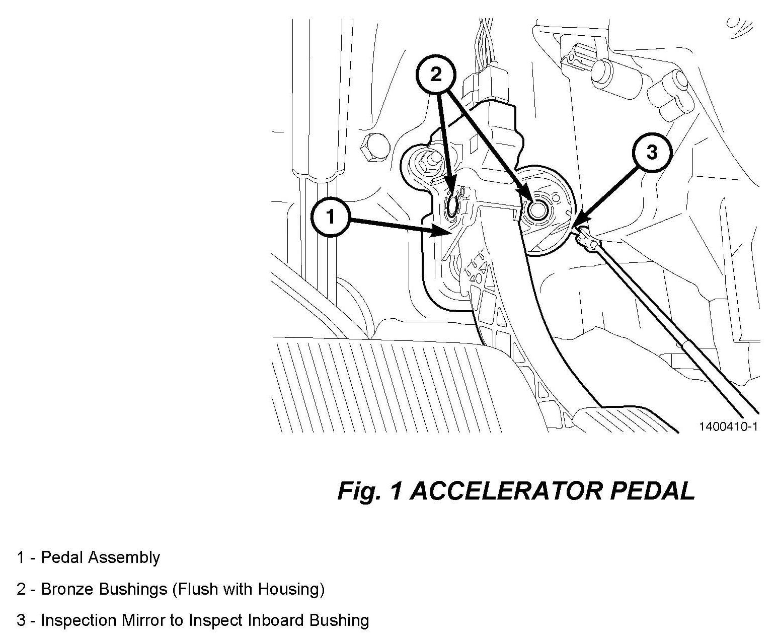 1. Inspect the bronze pivot bushings located on each side of the pedal assembly housing. Are both bushings found flush with the surface of the assembly housing? (Fig 1).