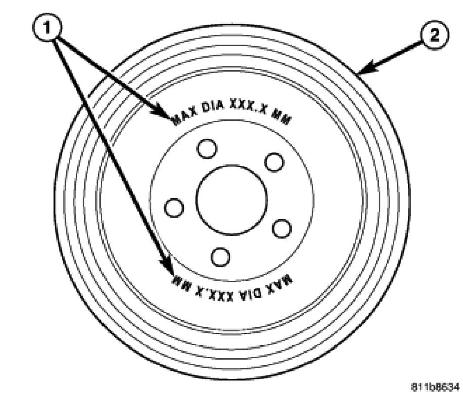 Always replace the drum if machining will cause the diameter to exceed drum maximum diameter. All brake drums (2) are marked on the inside with the maximum allowable brake drum diameter (1). Maximum brake drum diameter can also be found in the following table.