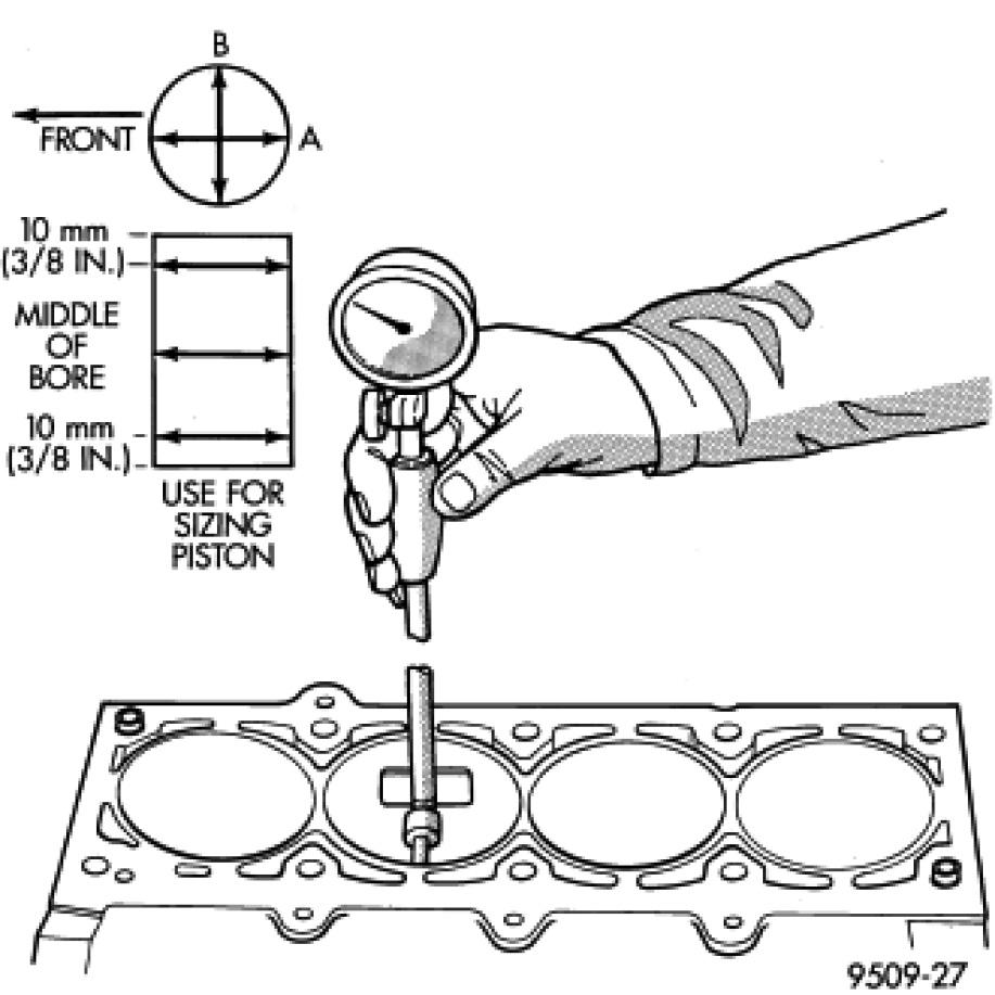 2. Cylinder bores should be measured halfway down the cylinder bore and transverse (measurement location B) to the engine crankshaft center line shown. Refer to for Engine Specifications.