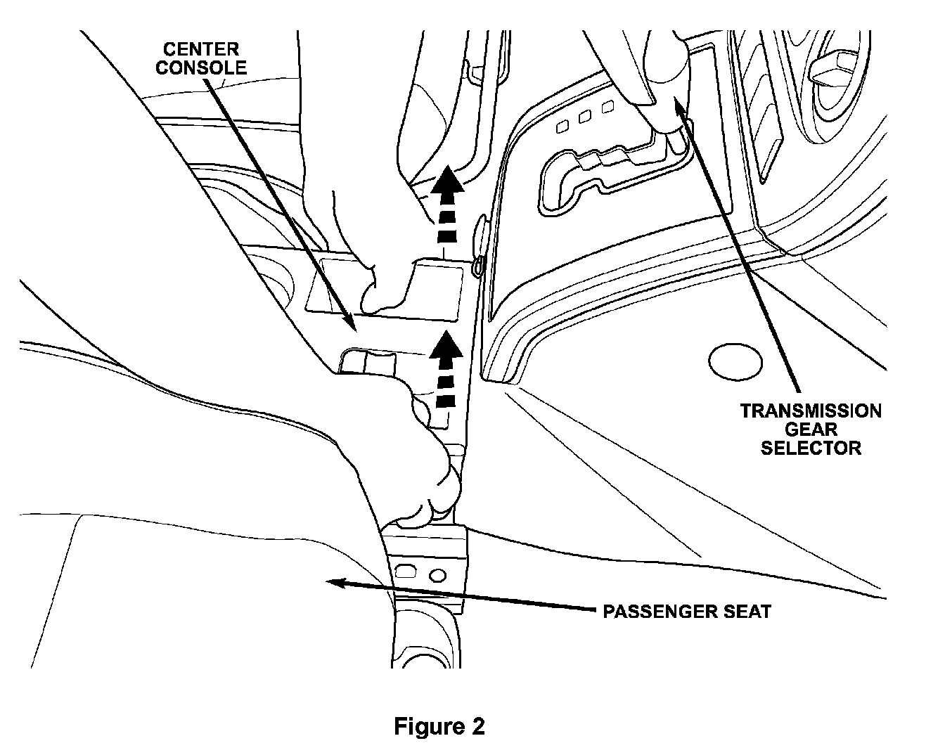 6. The front of the center console is held in place by two clips. Pull straight up on the front of the console to disengage the clips (Figure 2).