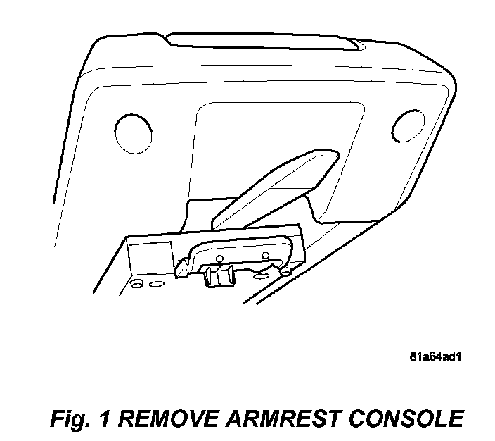 2. Using a trim stick (C-4755) remove the armrest console. Wedge the trim stick between the latch and the armrest console assembly (Fig. 1).