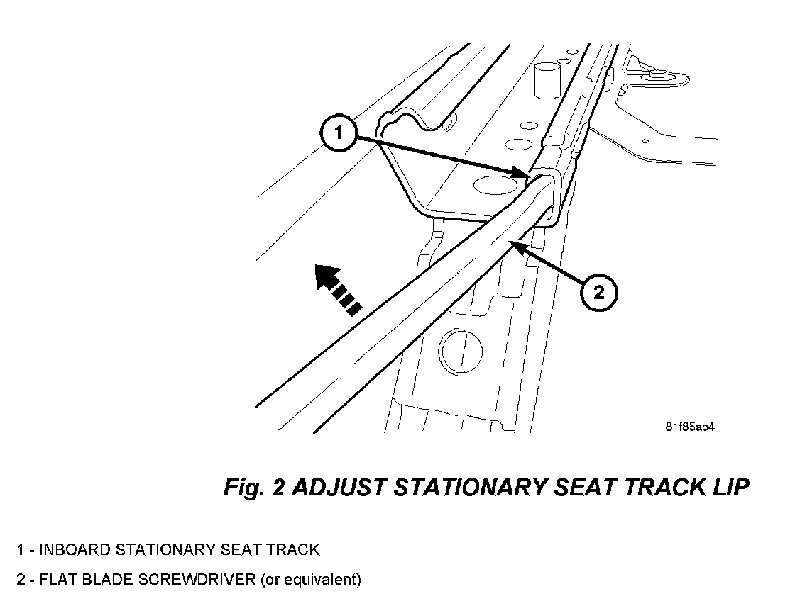 3. Carefully pry the stationary rail lip toward the center of the seat by prying with screwdriver toward the outside of the seat track providing additional rail to rail clearance of 0.5mm (0.020 In) (Fig. 2).