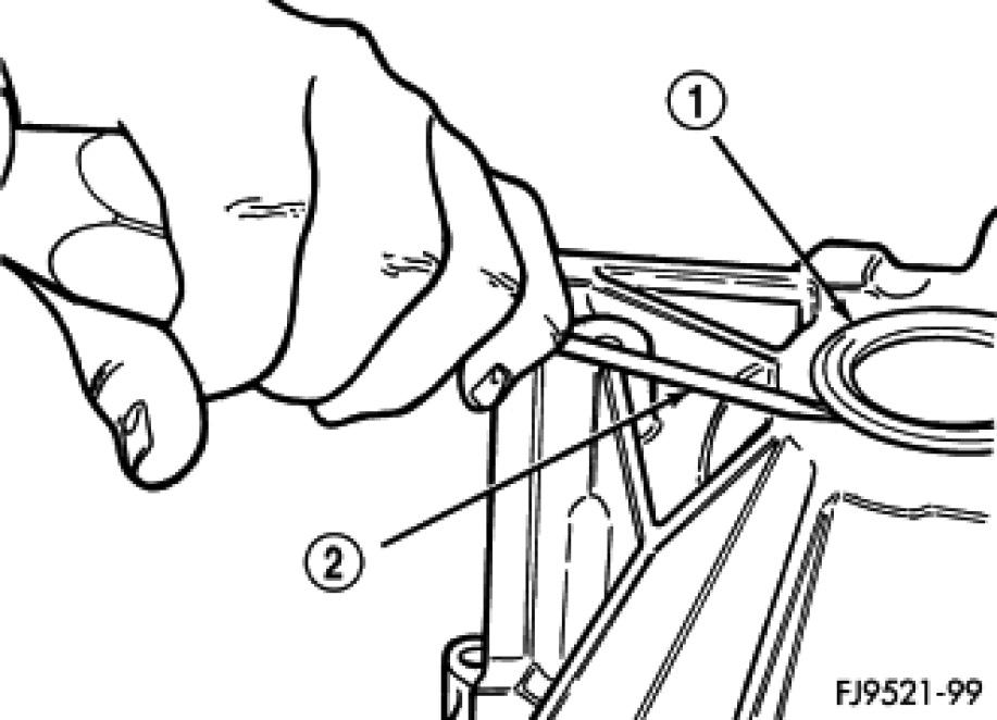 19. Tap on the pry tool (2) with a small hammer and remove both (case and bell housing sides) axle shaft seals (1).