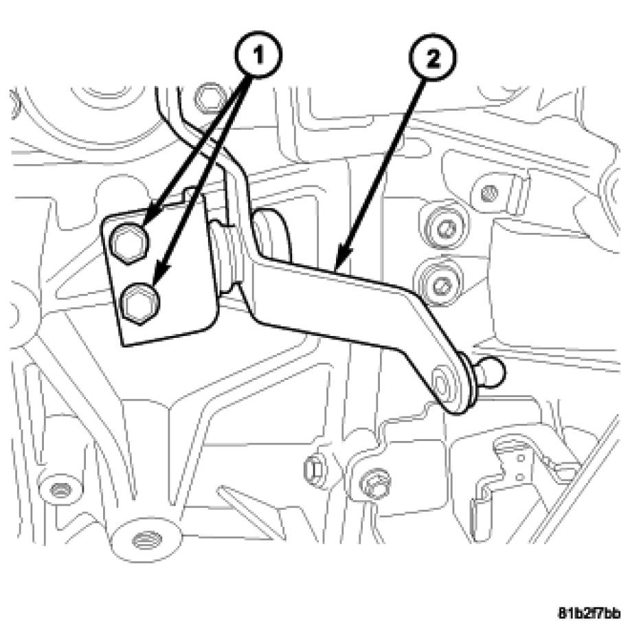 6. Remove bolts (1) holding crossover bellcrank (2) to the transmission case.